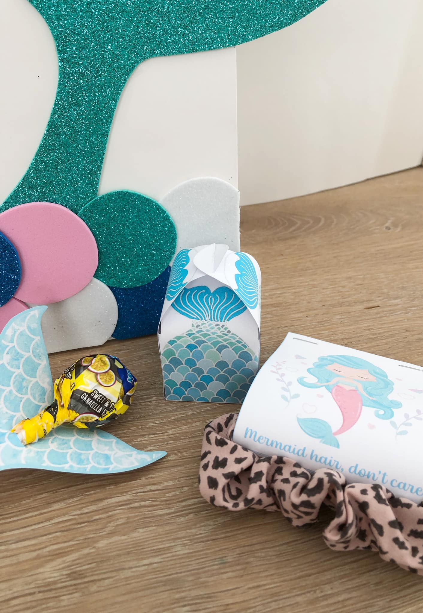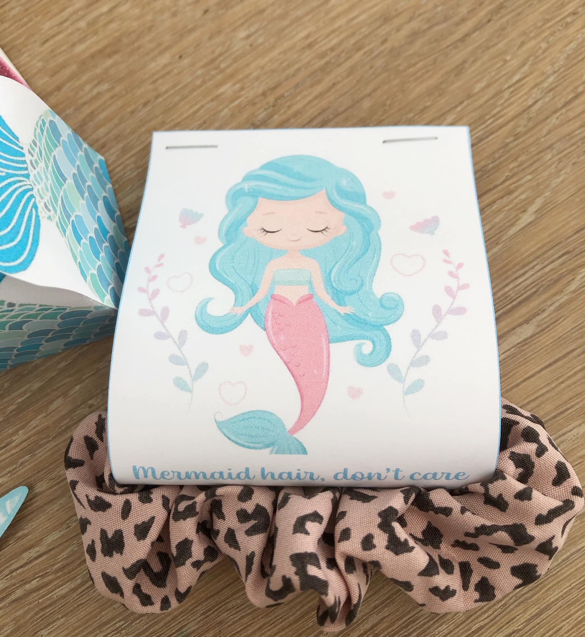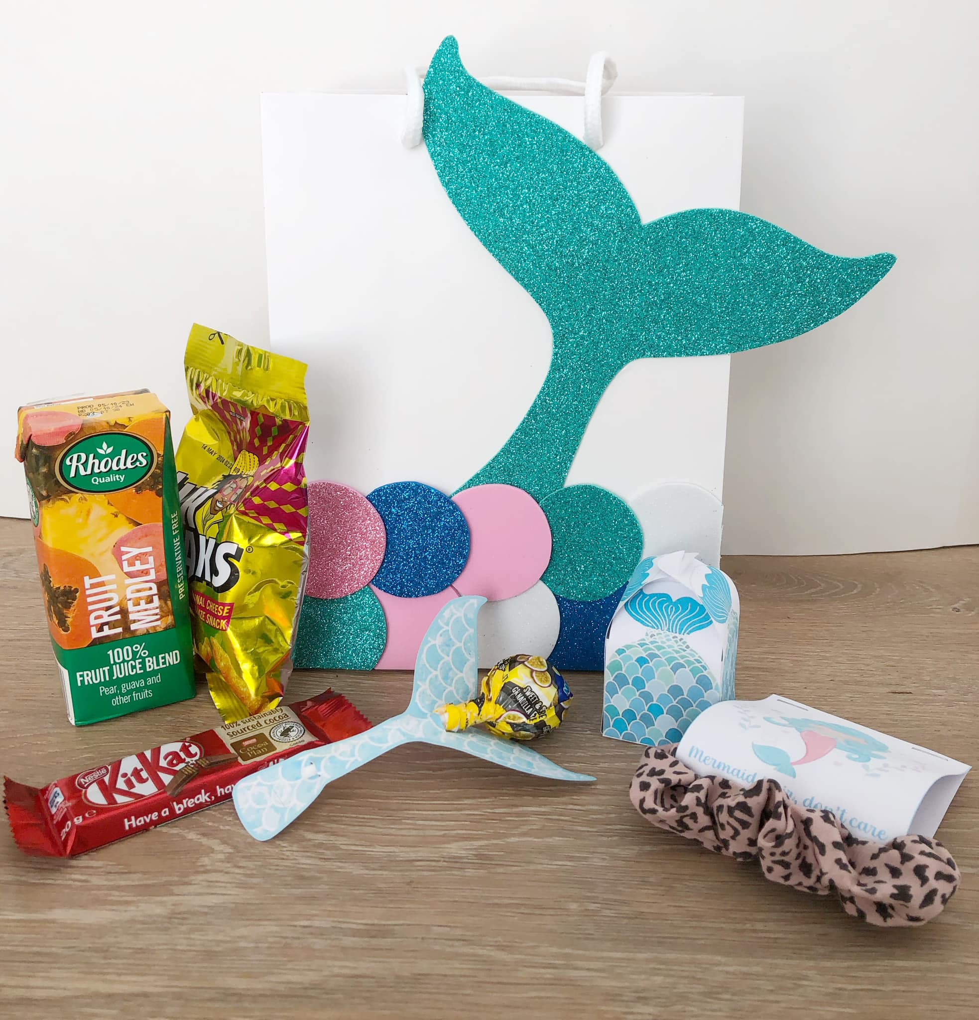 The bags include a themed sweet, gummy sharks, packaged in a cardboard shell box. Each bag also includes a hair scrunchie with a tag stating “Mermaid hair, don’t care”.